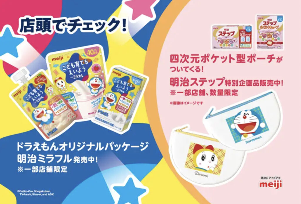 今回、明治の育児向け商品「明治ステップ」 と 「明治ミラフル」 は、国民的キャラクター ドラえもん とタイアップ。